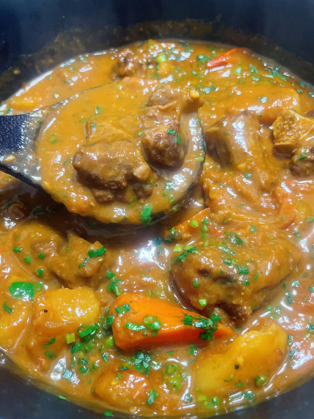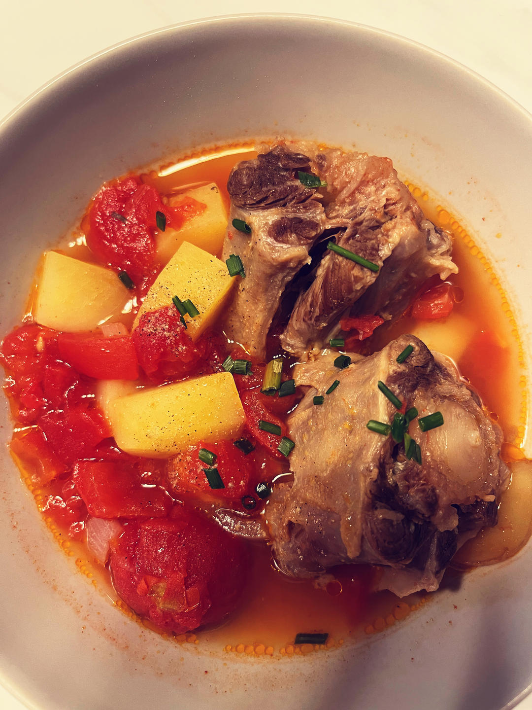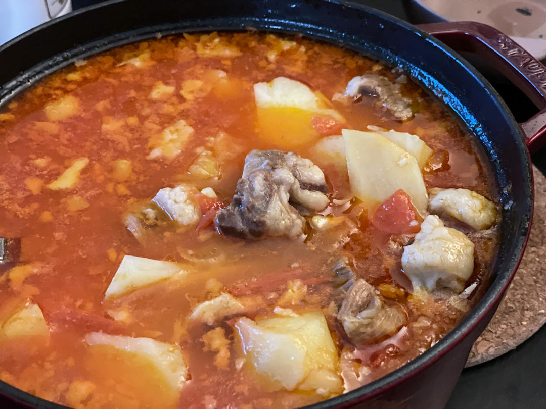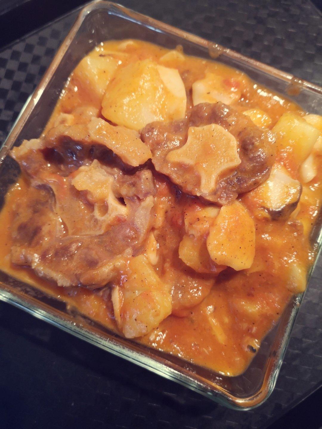 番茄,土豆,杏鲍菇和牛尾的组合,番茄已经烧化了。