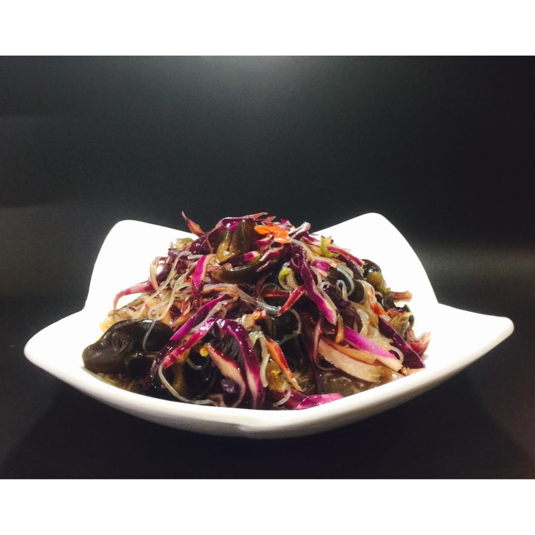 紫甘蓝按菜谱的方法拌好后放冰箱一晚,第二天加木耳、粉丝,很合我的口味。