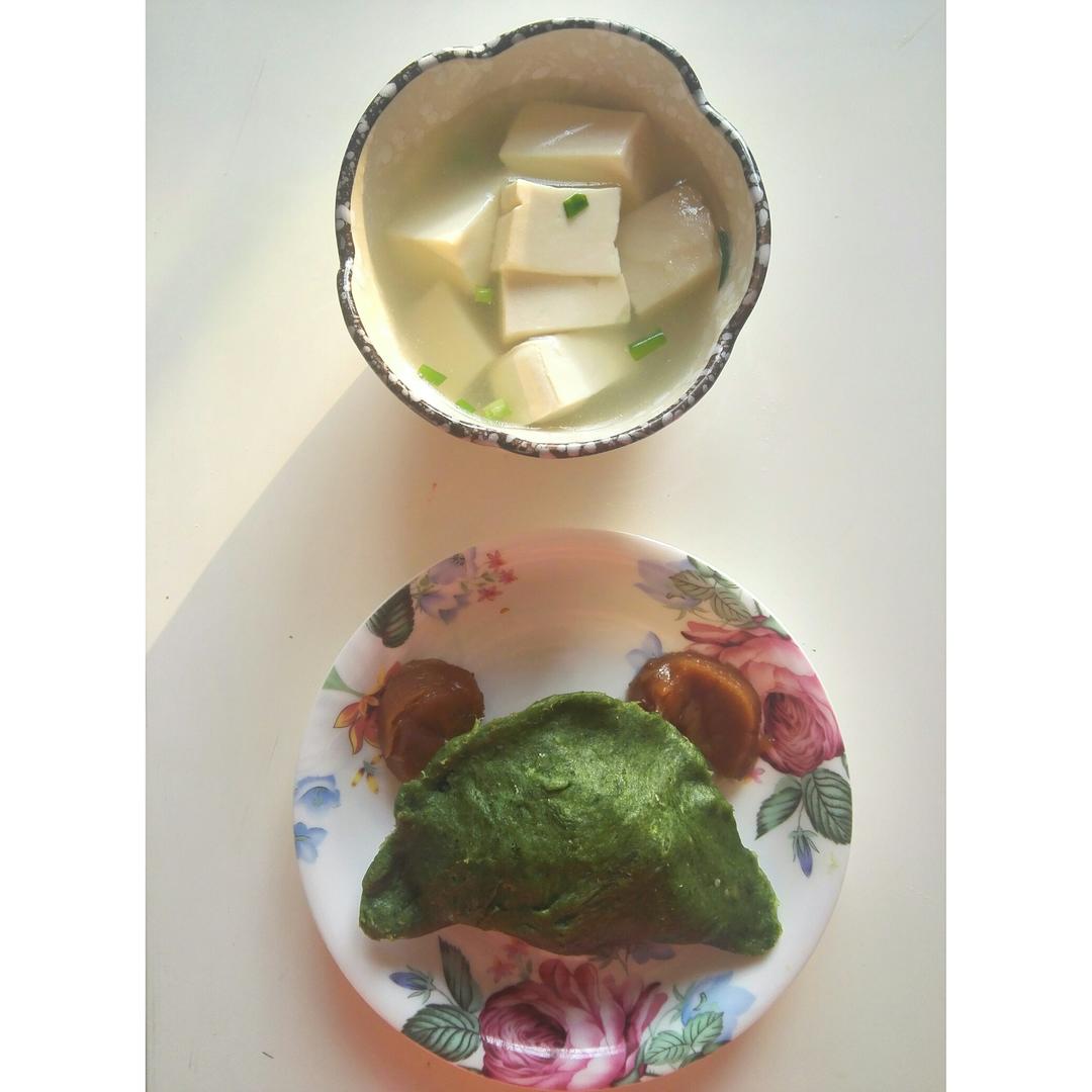 今天早上要吃素,所以青粿里面包了油饼和凉拌的蒜,吃了年糕,还有米冻豆腐汤~清淡的食物吃的实在是让人舒服~