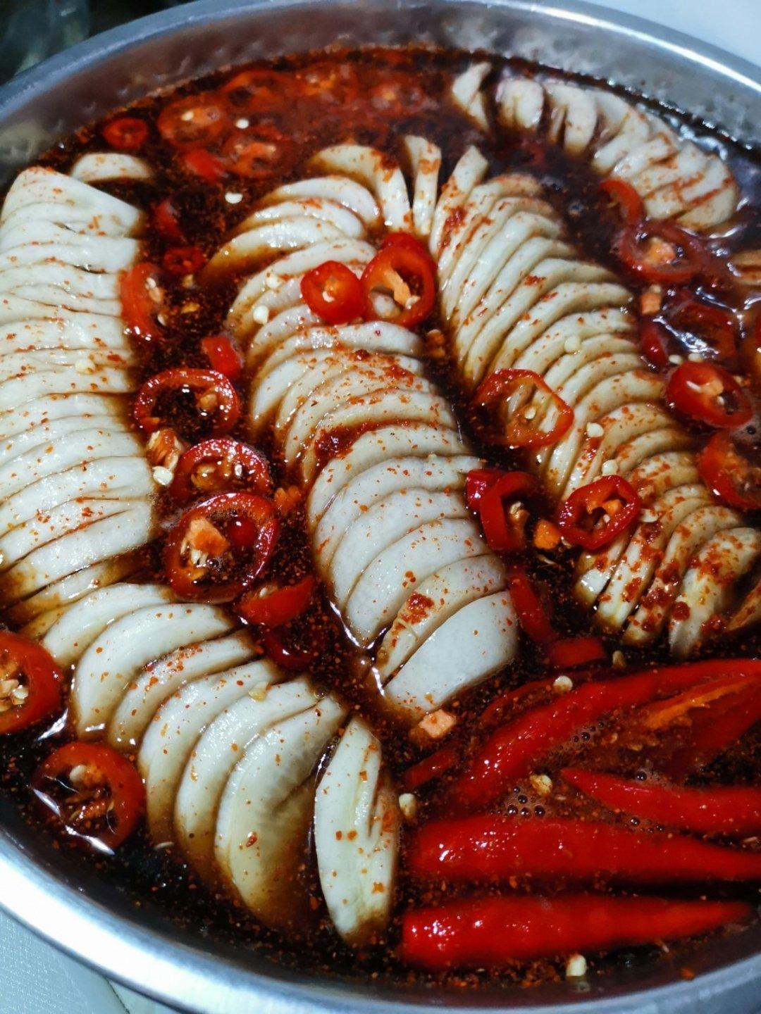 刚刚学的小咸菜,用的黑醋所以卖相不是很好,我自己还加入了少许的柠檬汁,还有我喜欢酸辣的所以放了点自制的辣椒油!不知道味道...
