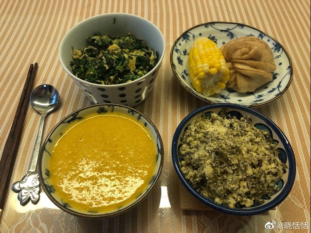 南瓜板栗小米糊,菠菜炒蛋,蒸胡萝卜叶,玉米,芝麻花卷。