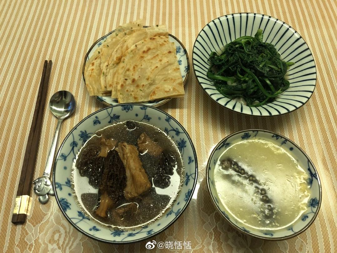 小米海参粥,清炒茼蒿,羊肚菌排骨汤,葱油饼。[鲜花]