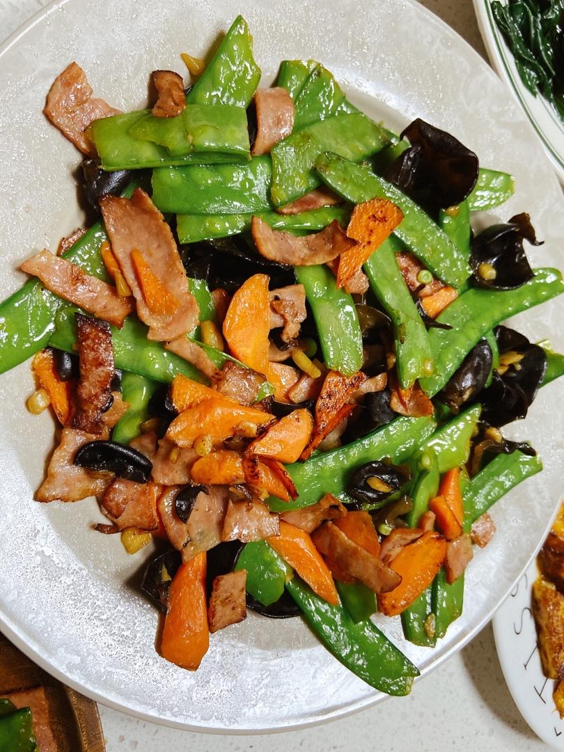 荷兰豆两头撕掉筋,洗干净,胡萝卜切成小片,黑木耳温水泡发后切片,3颗蒜拍碎,培根3条切碎。把所有蔬菜放入加盐的沸水中焯水...