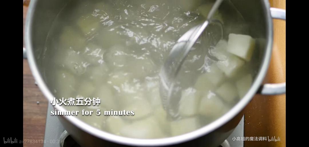 ①土豆切块,大火烧开,小火煮五分钟。