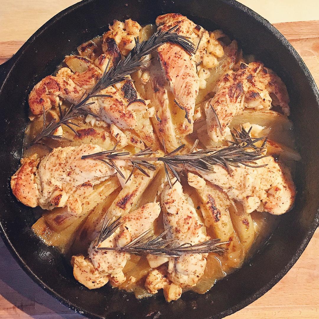 除了鸡胸,浸透酱汁的土豆也好好吃,特别是broil之后皮微焦的那几块,第二顿可以把鸡胸拿开再broil一下。特别喜欢带皮...