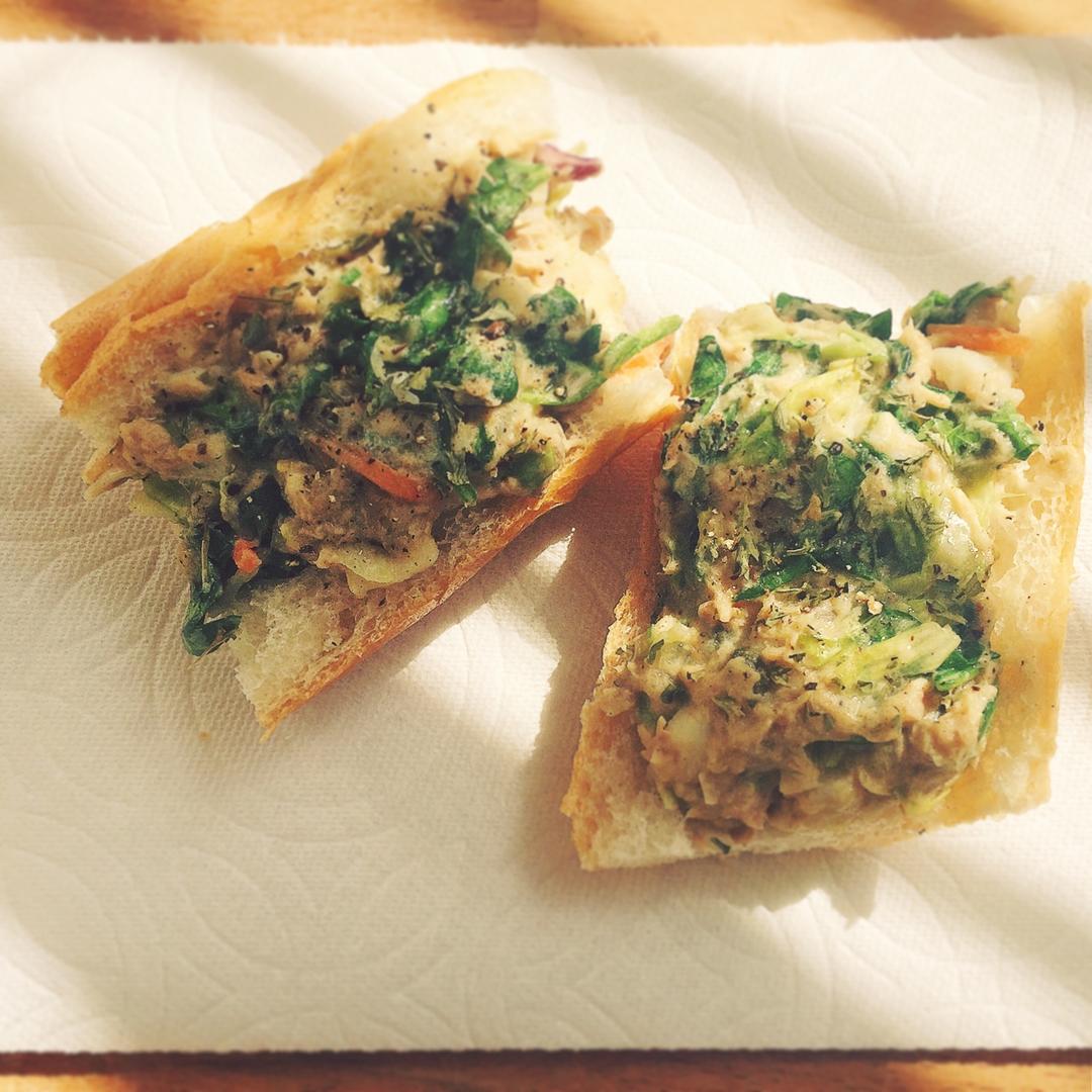 配法棍很不错,之前做的蜂蜜芥末土豆烤鸡胸还剩一点烤土豆,切块和蔬菜一起拌进去了,口感很丰富。 #早餐•2017年3月26...