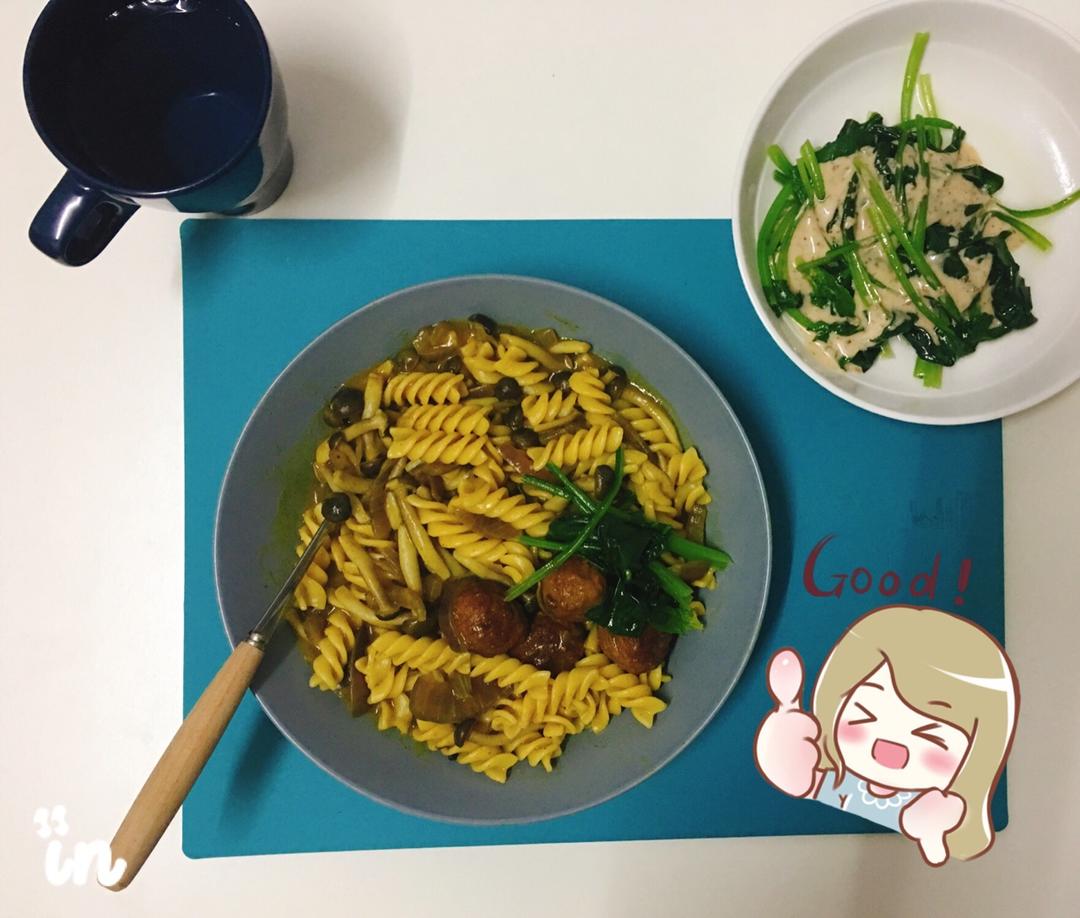 咖喱蟹味菇意面,