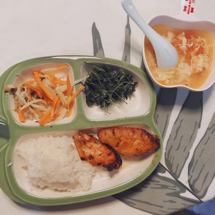 儿童营养餐。番茄蛋汤/奥尔良鸡翅/雪菜茭白胡萝卜小炒/蒜泥草头