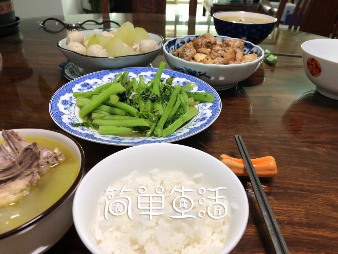 煎多春鱼,炒娃娃菜,卤鸭肉,炖鸽子汤,二人三菜一汤食