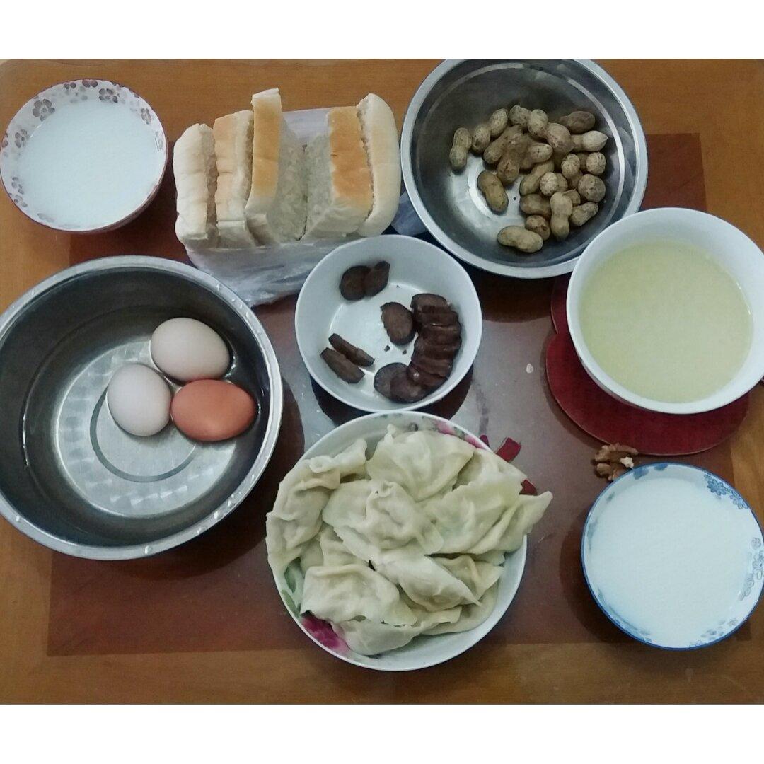 白吐司,白菜猪肉饺子,腊肠,煮花生,鸡蛋,小米粥,牛奶。#面包进...