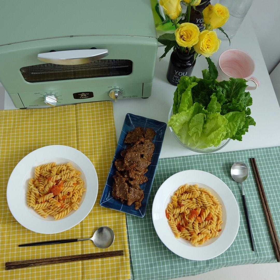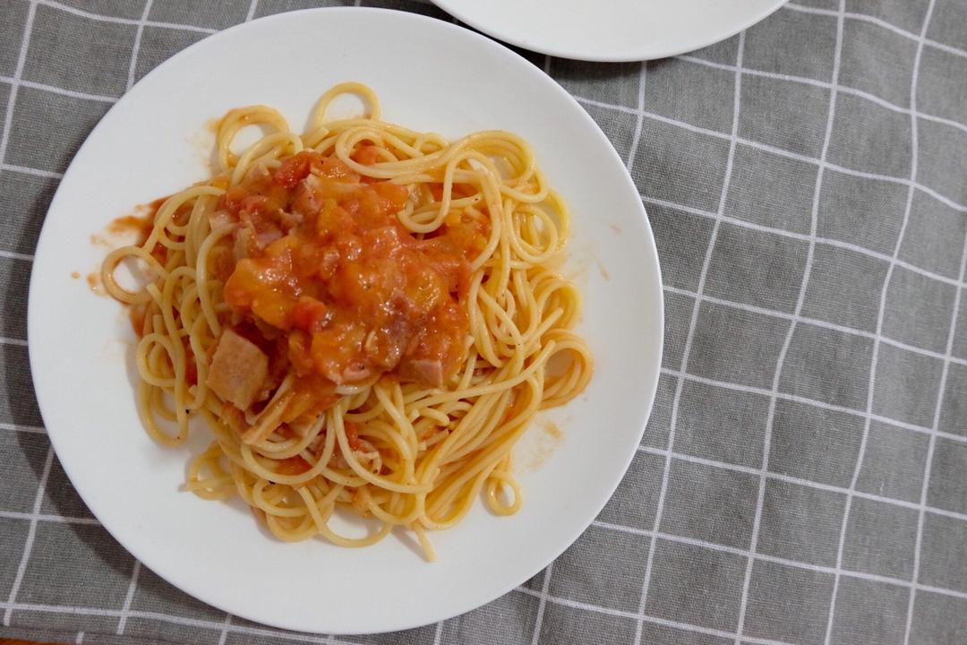 其实本来是想做番茄肉酱意面的,结果发现冰箱里的肉居然有点臭了😂😂只能扔掉做培根了