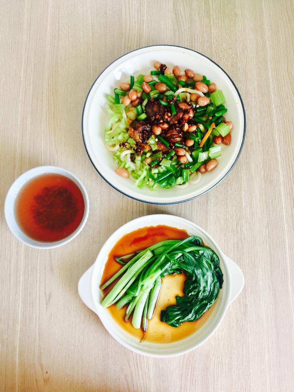57#腊汁肉拌面、白灼菜心、绿豆汤