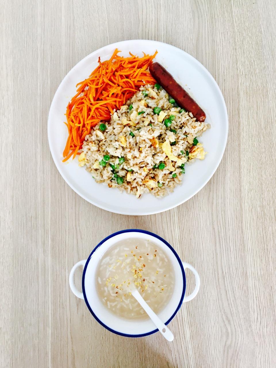 61#青豌豆蛋炒饭、味霖炒胡萝卜、辣味台肠、桂花糊米酒