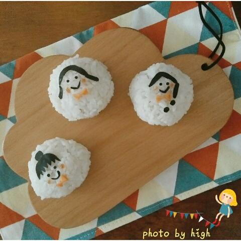 哈哈,今天做了饭团,里面是包了肉松的哦,今天起的早,就用海苔剪了三个小女生的发型和表情,还用...