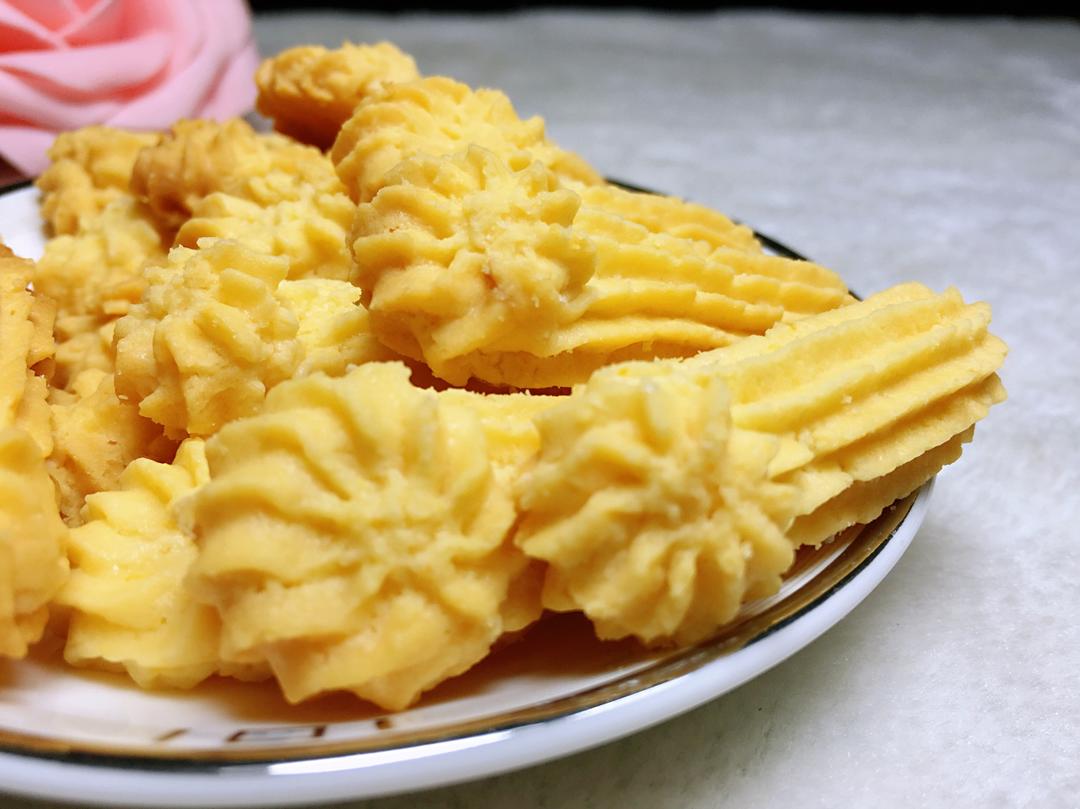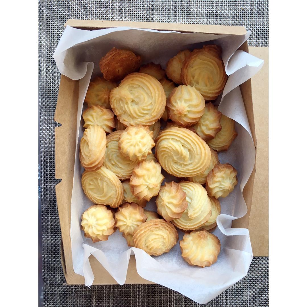 😂谢天谢地,有点学会裱花了。终于不再是裱到一半直接下手那种了~属于甜咸系列的曲奇,下次盐放一克试试。180度中层25分钟...