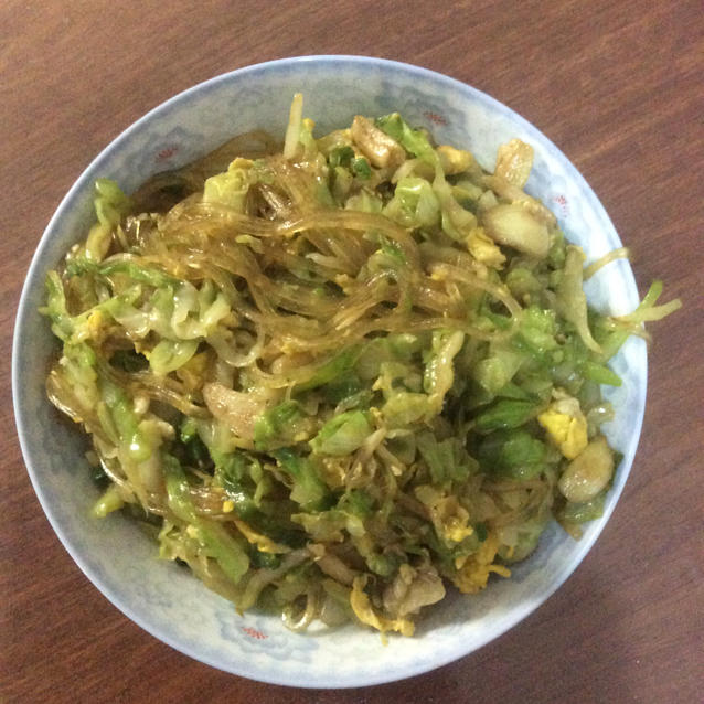 没有粉丝放了粉条,口感不太对。另外鸡蛋放晚了,出锅前才加进去翻炒了几下,导致鸡蛋和包菜之间互相不入味。 #晚餐•2017...