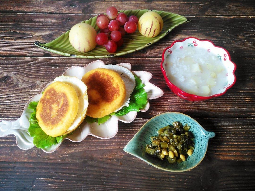 马蹄粥*红薯饼夹蛋*雪菜炒豆*水果