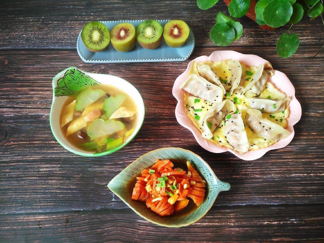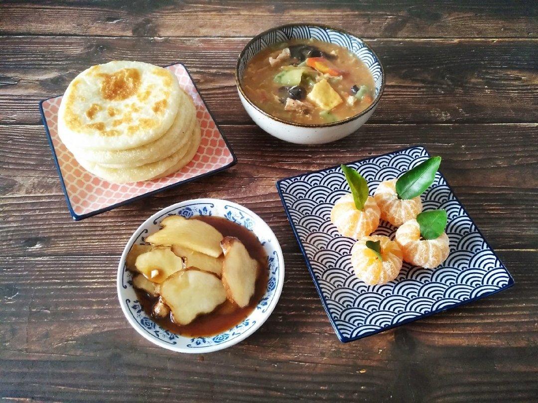 韭菜面叶汤*烫面小糖饼*拌洋姜*水果