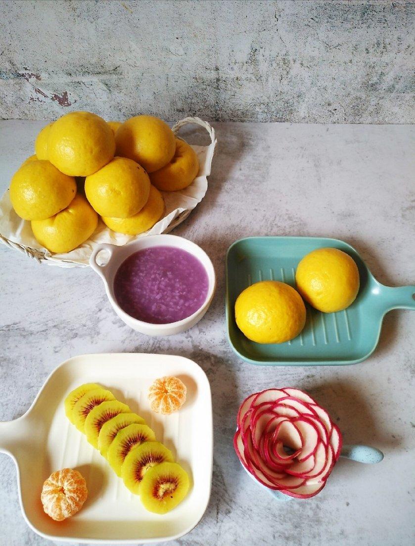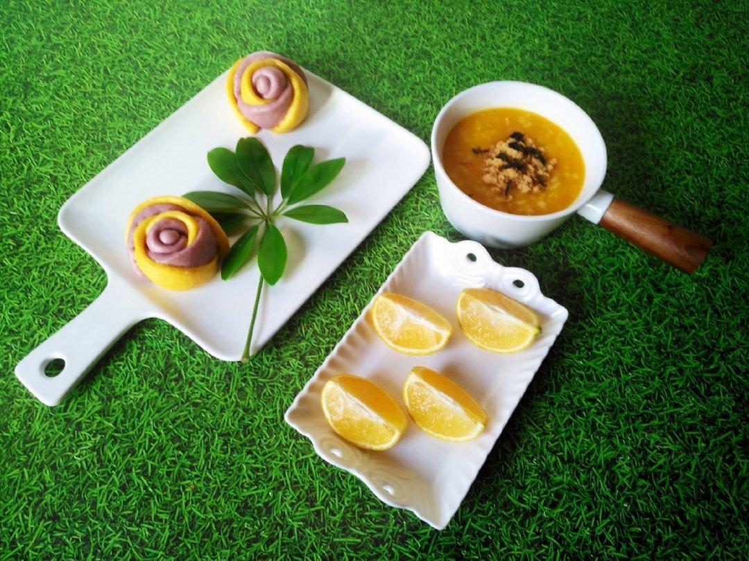 肉松咸蛋南瓜粥*花朵馒头*水果