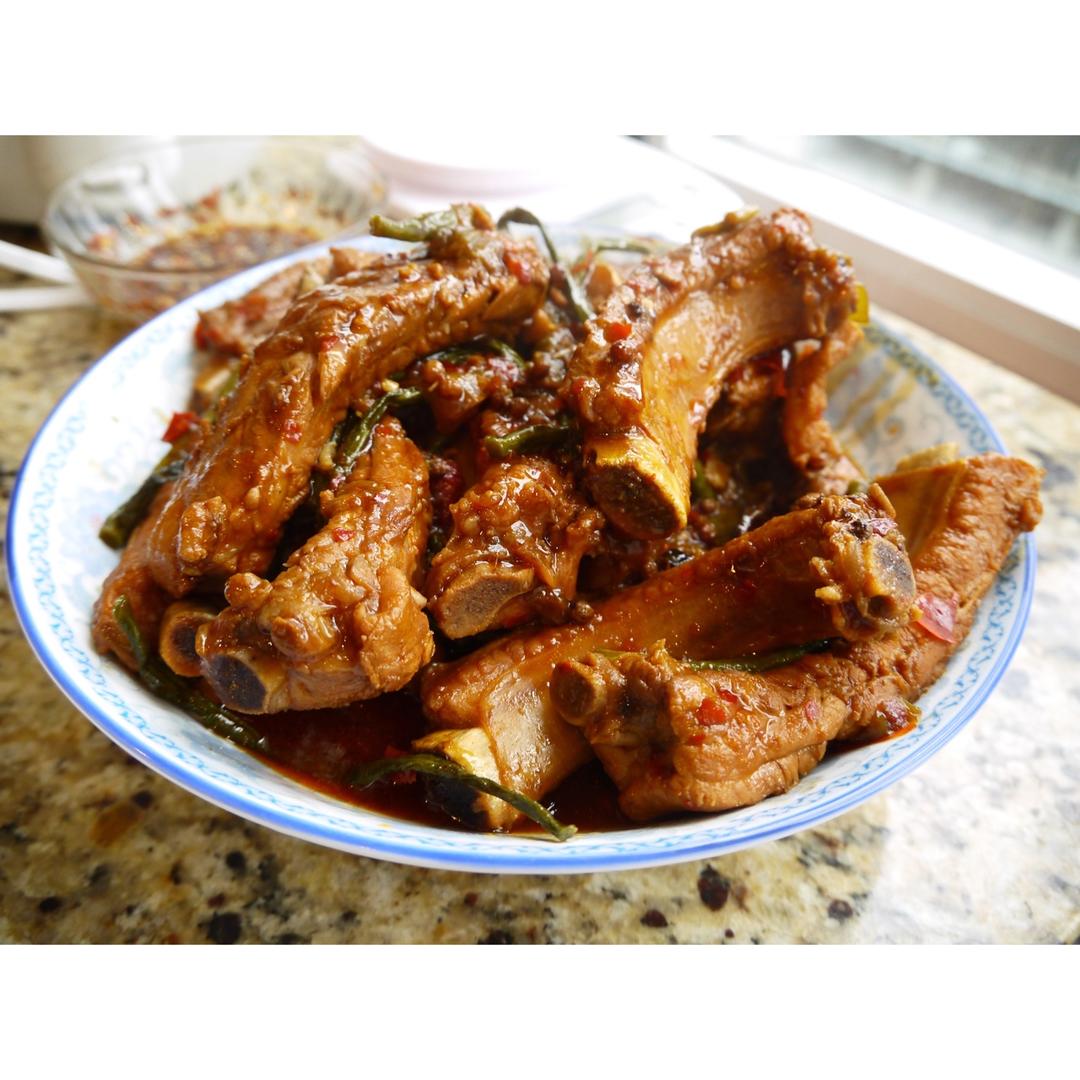 中午做了辣炖排骨。郫县豆瓣酱+黄豆酱+番茄酱+香料,蜜汁好吃,我自己吃了4个……………