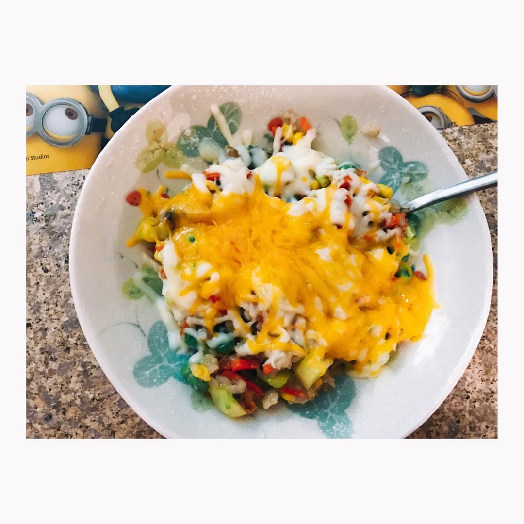黄瓜,胡萝卜,豌豆,玉米,瑶柱,炒杂米饭,焗奶酪。