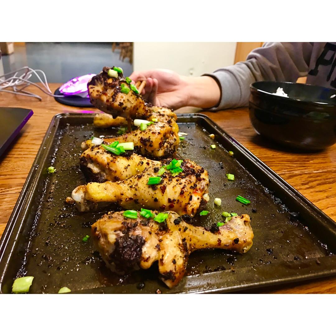 没有调料的情况下发明的烤鸡腿。老干妈黑椒盐。贼好吃。