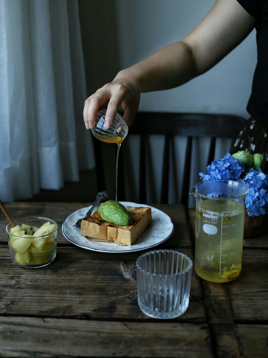 发太晚的早餐,牛油果厚吐司淋百香果蜜