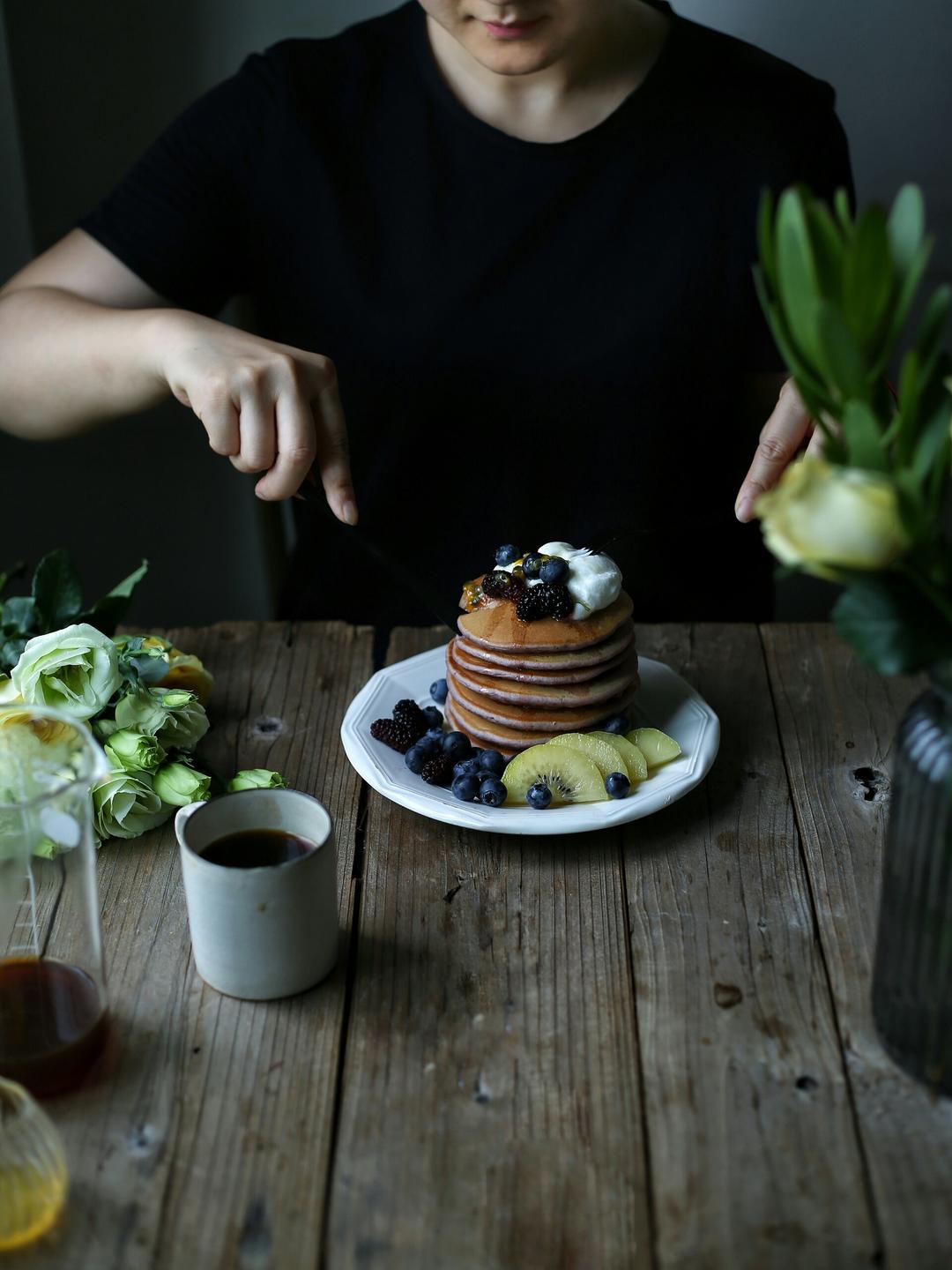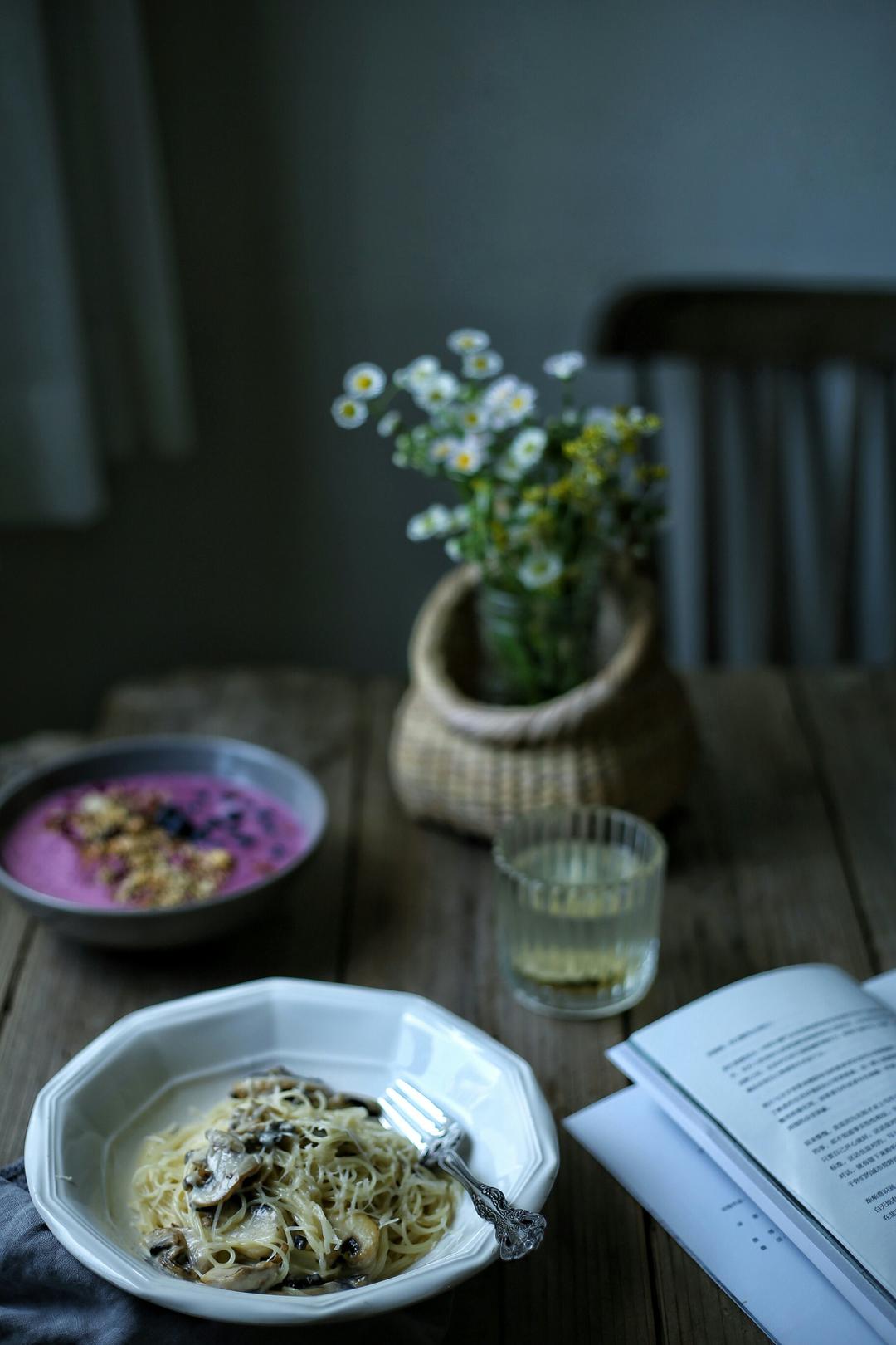认真吃早餐,蘑菇奶油意面,桑椹奶昔配家乐氏的玫瑰麦...