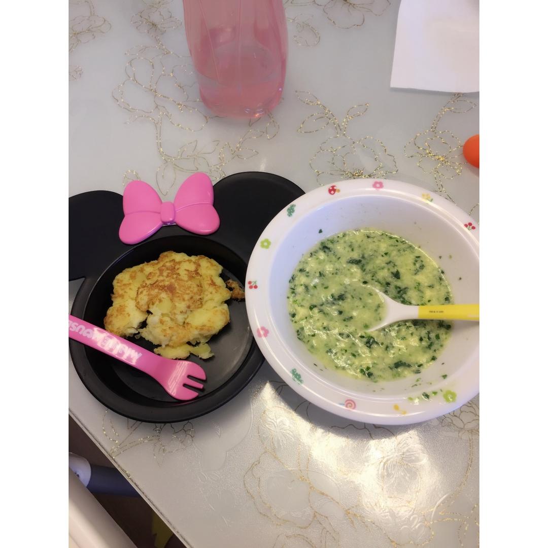 三文鱼土豆泥饼+菠菜蛋花汤
