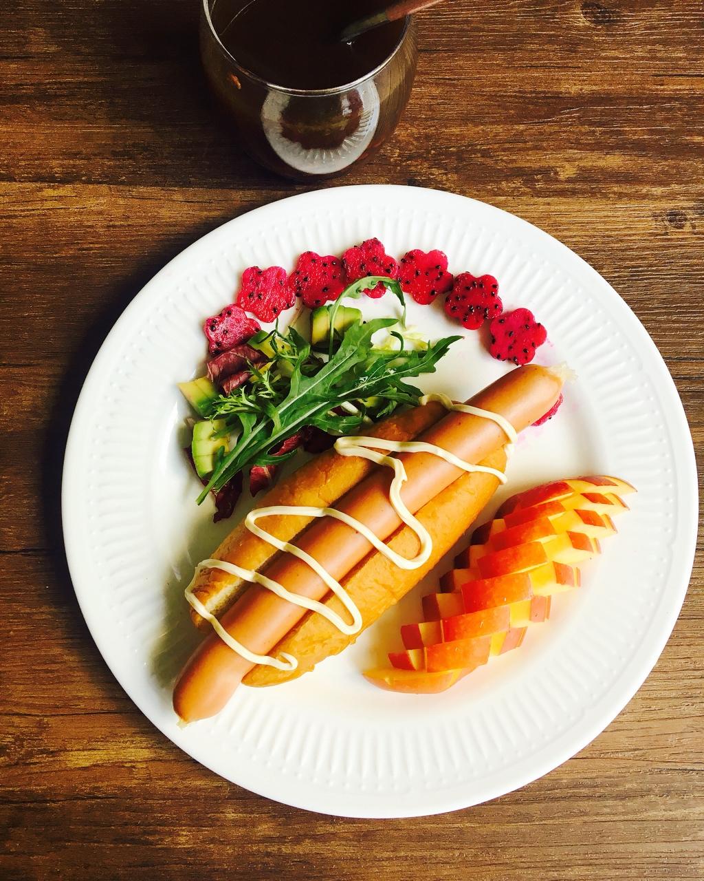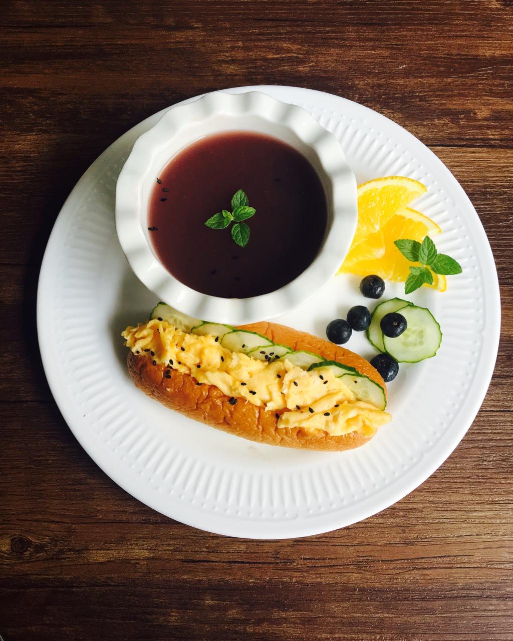 早餐打卡~香甜的红豆汤,超满足的大热狗包,可口的果蔬,🍴☕️