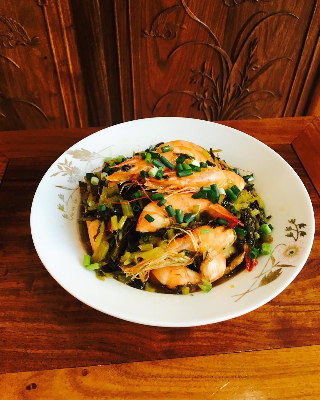 邻居家自制的酸菜香味浓郁,海虾搭配下饭好菜♨️