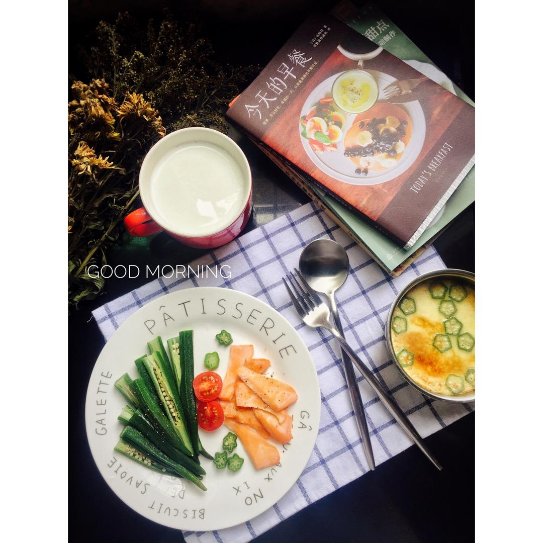 水煎三文鱼➕秋葵➕蒸蛋➕牛奶