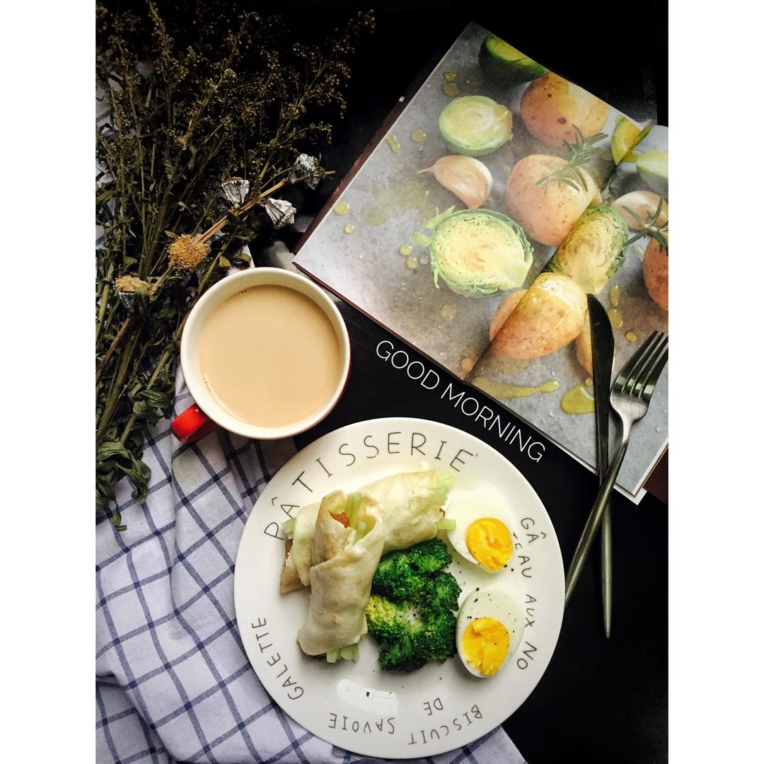 鸡肉卷➕西兰花➕水煮蛋➕牛奶咖啡