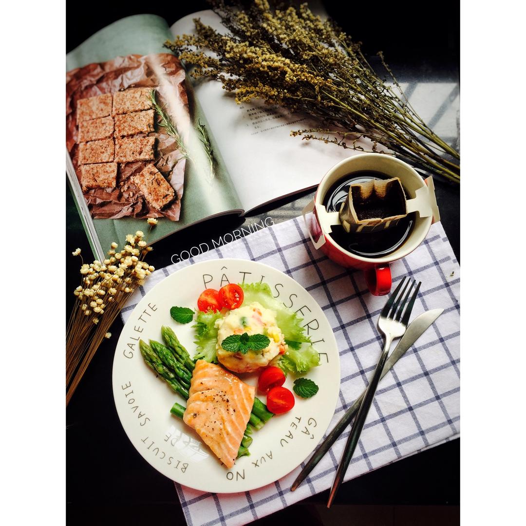 水煎三文鱼芦笋➕土豆泥沙拉➕挂耳咖啡
