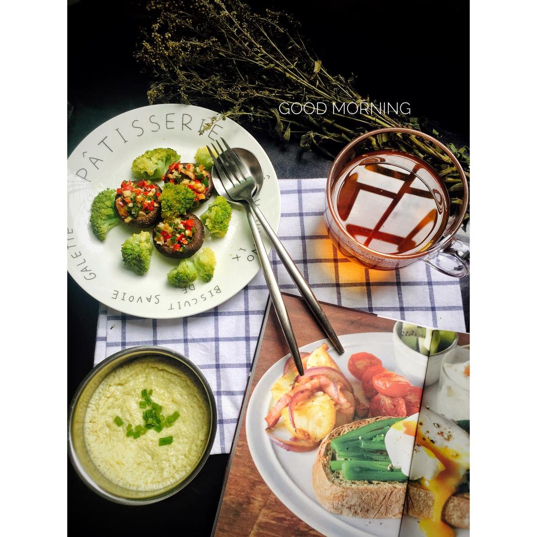 烤香菇➕西兰花➕蒸水蛋➕黑糖姜茶