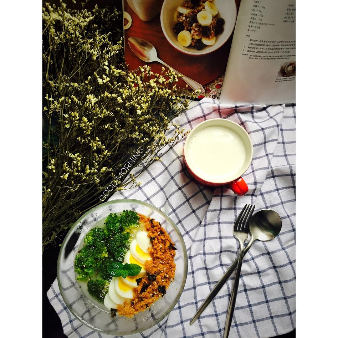 白粥➕西兰花➕水煮蛋➕海苔肉松➕牛奶
