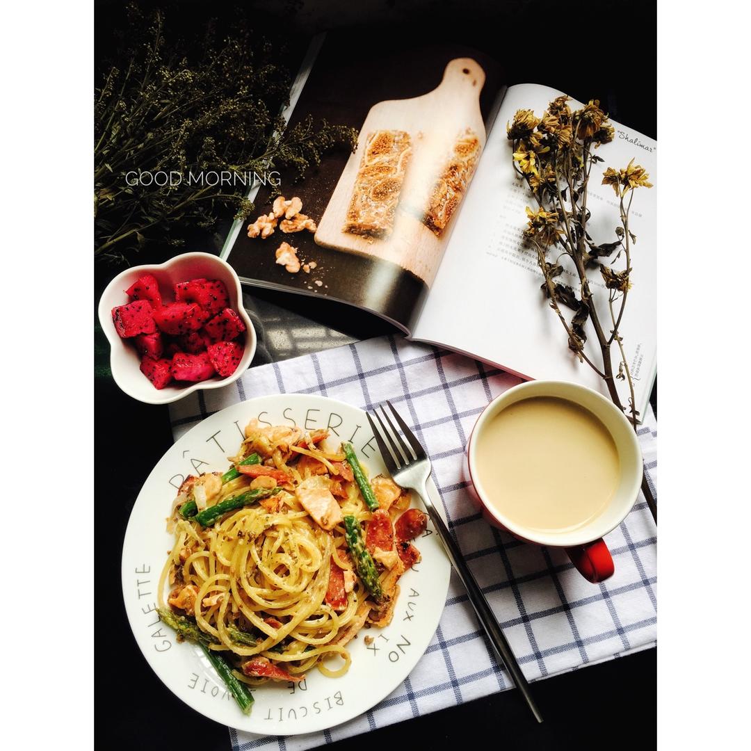 奶汁三文鱼意面➕红心火龙果➕牛奶咖啡