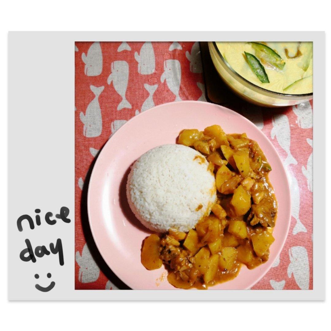 晚餐:黄瓜🥒皮蛋汤➕番茄🍅咖喱盖浇饭🍛,皮蛋颜色不同的原因这次的汤是奶黄奶黄的呢~