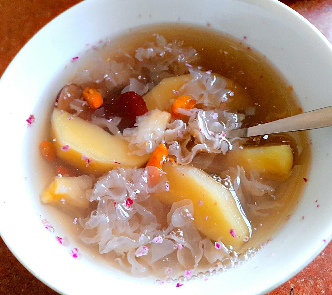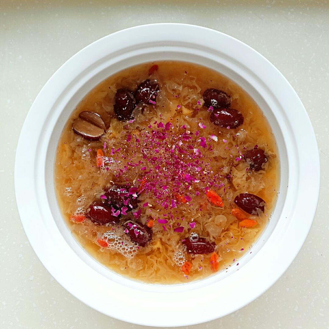 补发图,国庆节熬的银耳羹,里面有大枣、枸杞、桂圆、葡萄干、莲子、玫瑰花。😋😋...