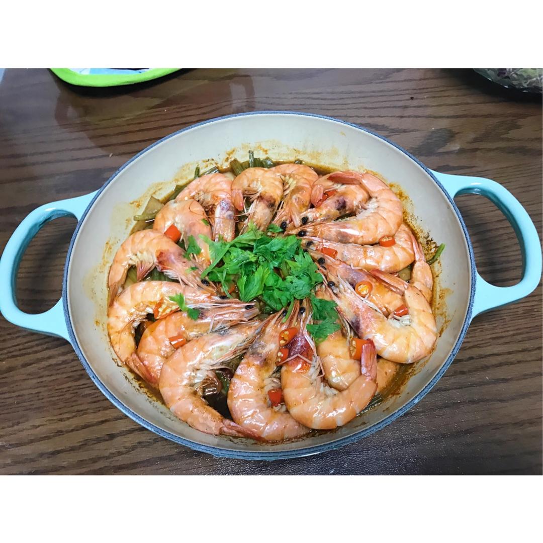 加了芹菜和小米椒。腌虾的时候加了少量白酒。完美