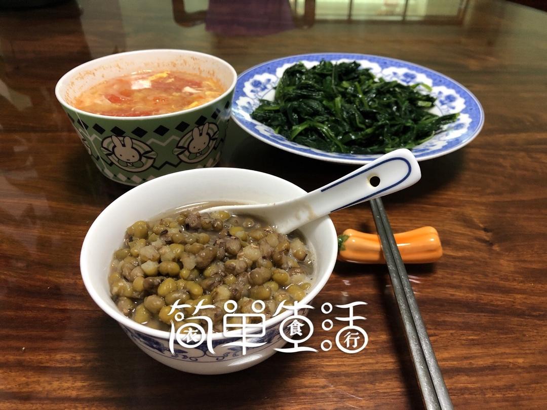 绿豆汤,西红柿鸡蛋汤,猪油拌青菜