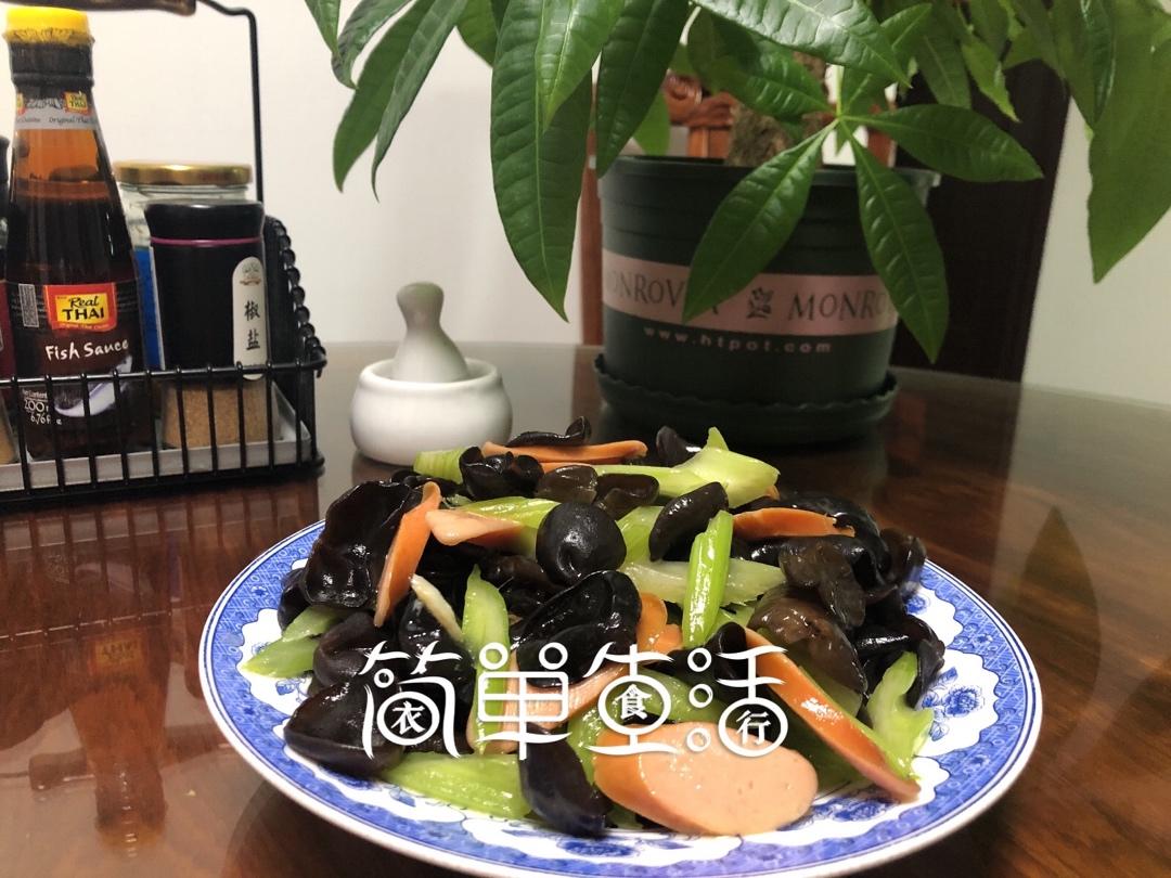 脆皮肠芹菜炒樱桃木耳,绿豆粥