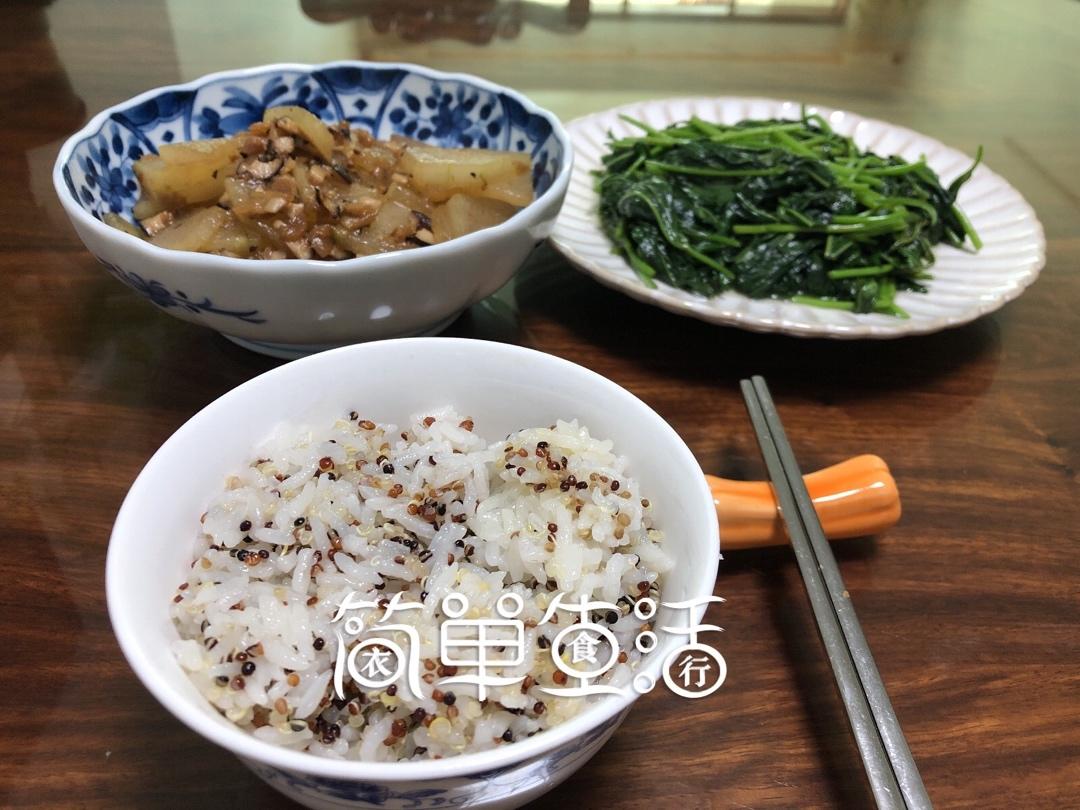 三色藜麦饭,炒香菇冬瓜,炒青菜
