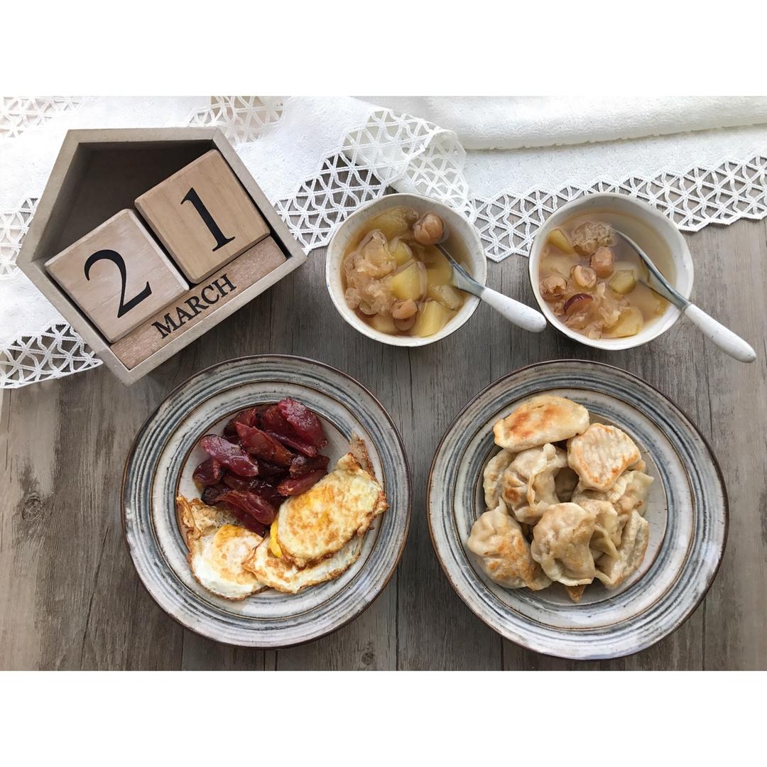 煎土鸡蛋、广州酒家的广味香肠、白菜猪肉馅饺子