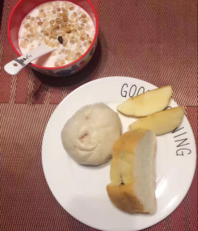 牛奶麦片,芝麻酱面包片,🍎