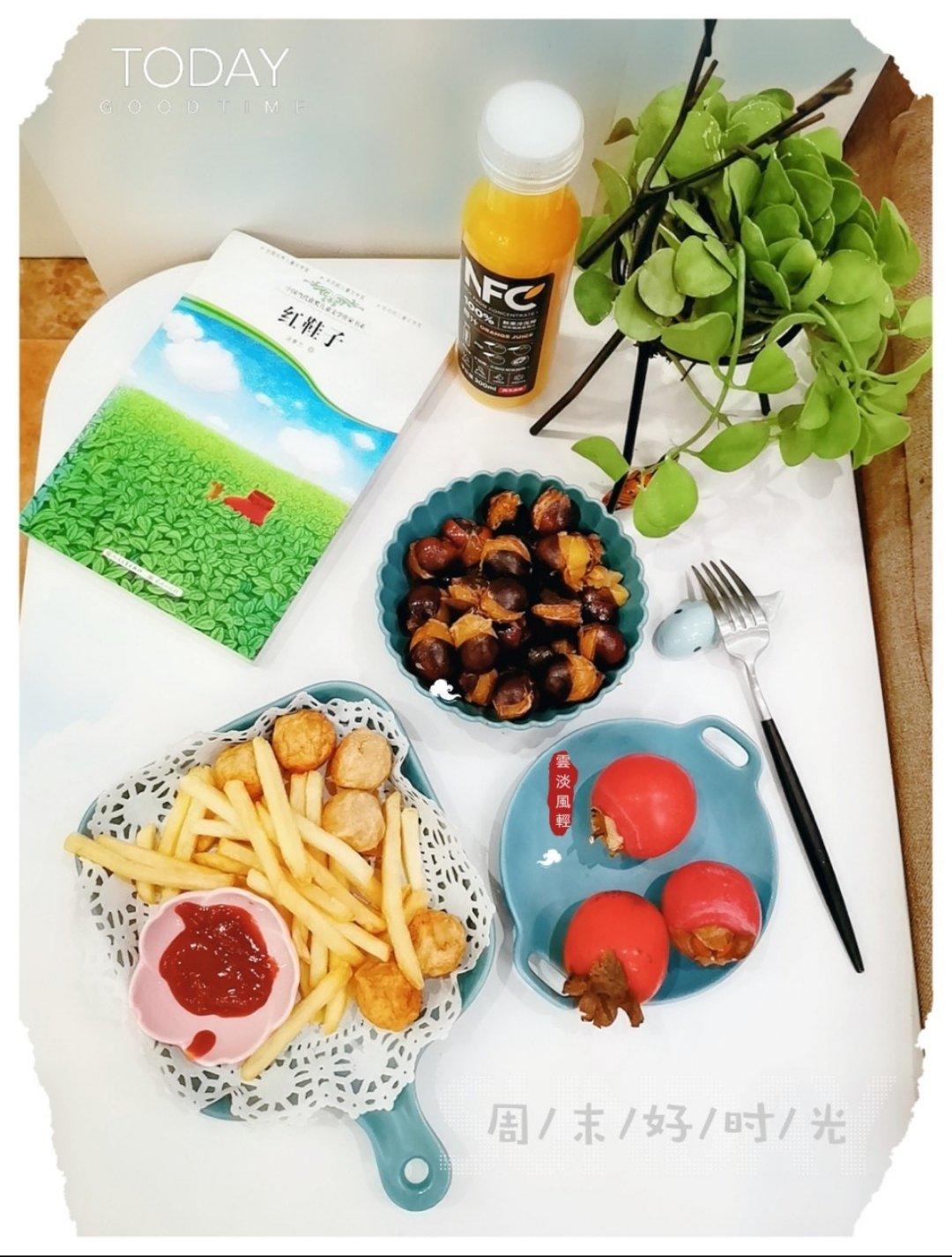 薯条🍟炸丸子+冰糖栗子+三两柿+橙汁