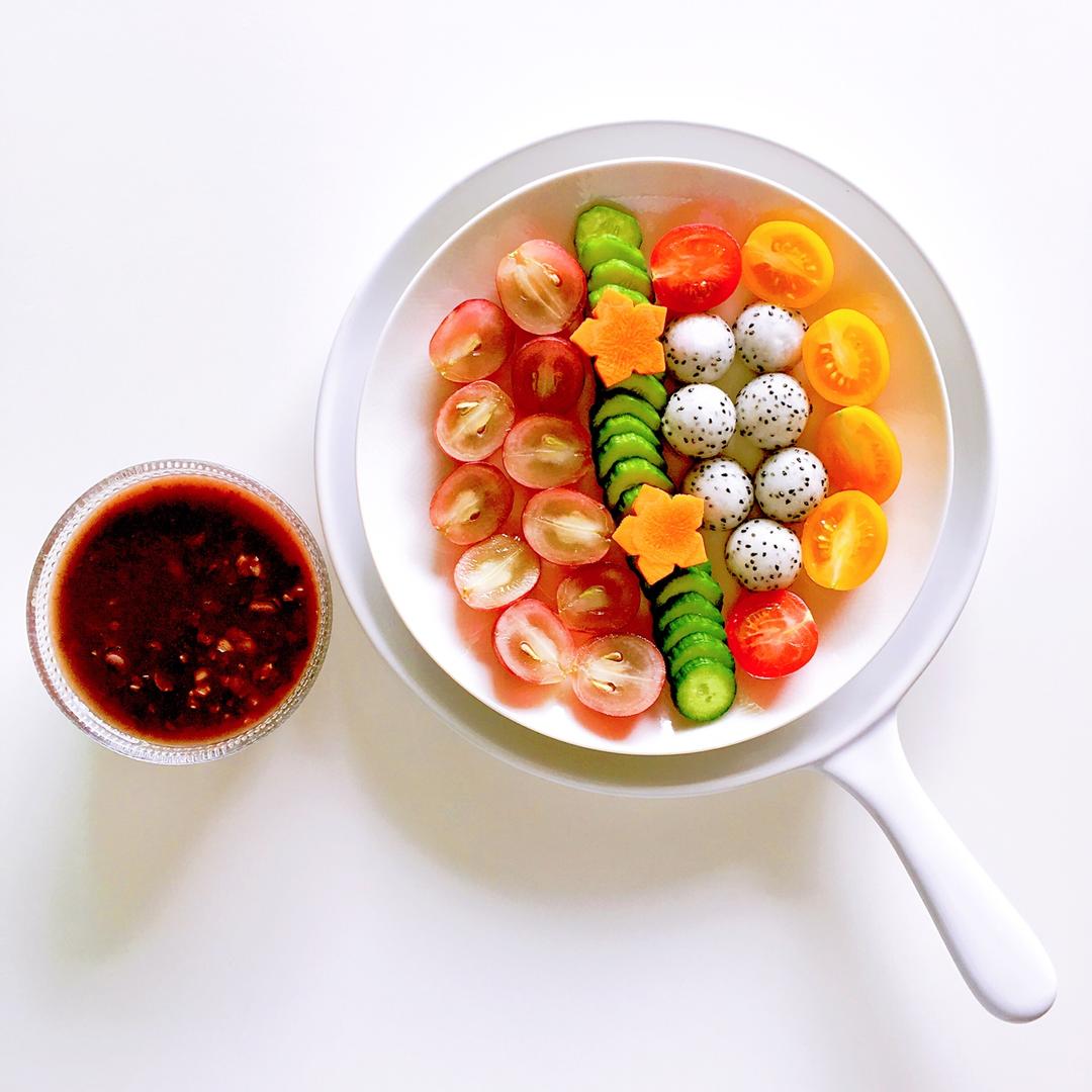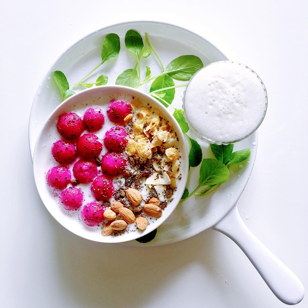买到了貌美又美味的火龙果,做火龙果overnight oatmeal(低脂无糖酸奶加燕麦,topping有火龙果球、玉米...