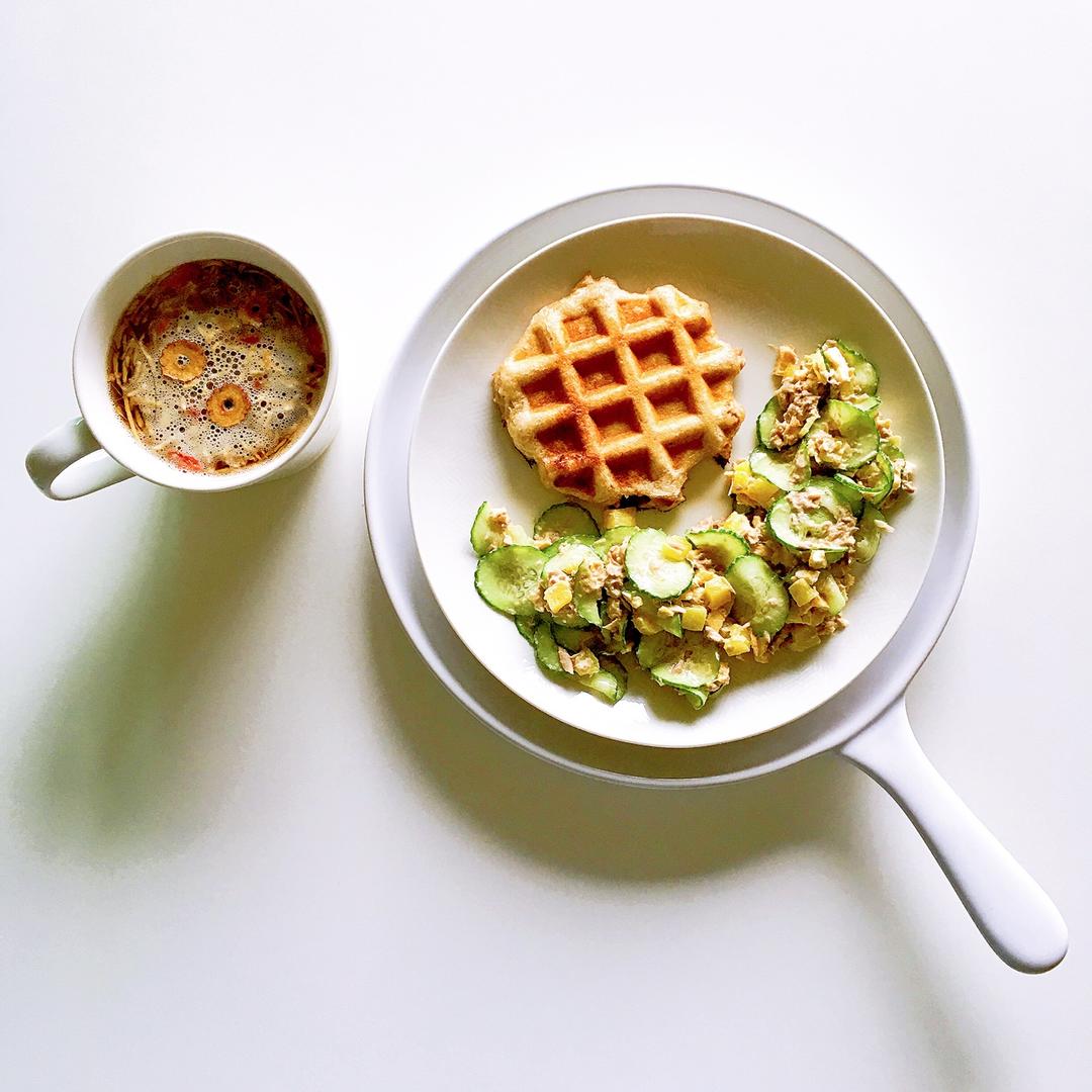 突发奇想,用包子皮和吞拿鱼沙拉做了一个咸华夫,觉得味道也很不错啊。搭配吞拿鱼青瓜沙拉和姜枣茶。 #早餐•2017年5月2...