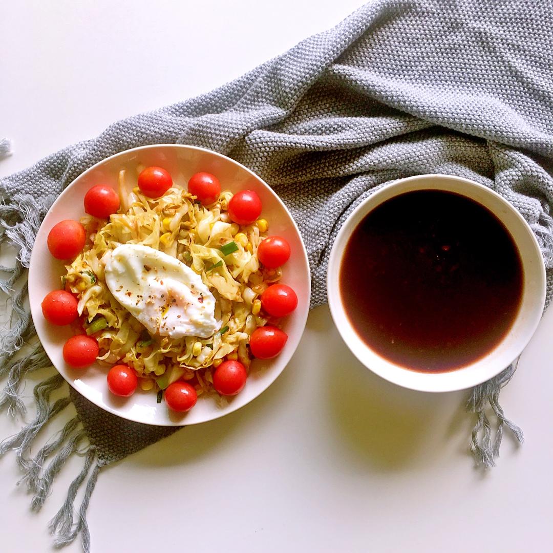 新周快乐🌹🌹今天的早餐:清炒卷心菜撒点胡椒粉,水波蛋,杂粮粥,圣女果。昨天八百年一遇地去爬了一回山,累得不要不要的,现在...