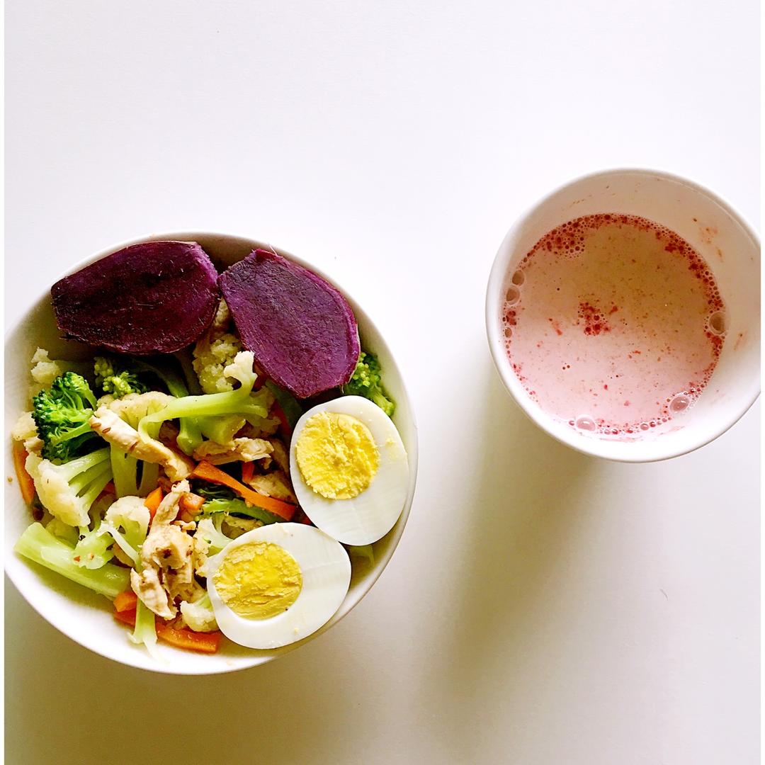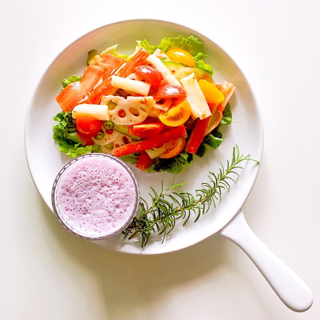 昨夜被风雨吵醒,今天送孩子上学路上大塞车,这讨厌的下雨天。早餐:泰式甜辣酱拌蔬菜沙拉,紫薯牛奶。 #早餐•2017年5月...